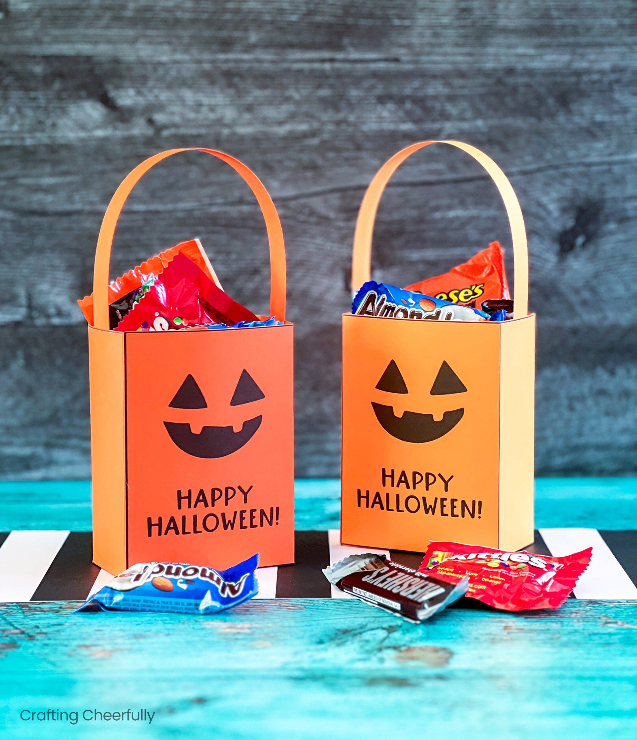 Create cute pumpkin treat boxes for Halloween! These fun free printables have a jack-o’-lantern design and can be printed directly onto orange cardstock for a simple Halloween paper craft perfect for holding sweets and treats.
